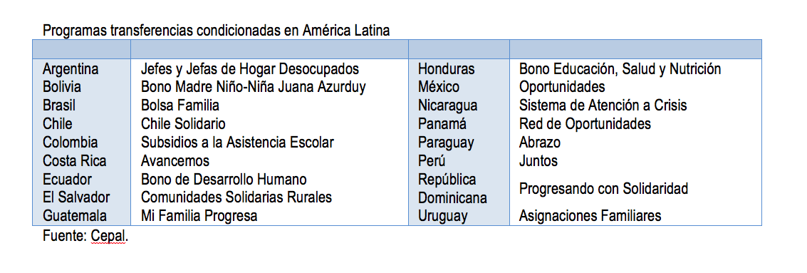 En solo una década el porcentaje de latinoamericanos receptores de subsidios condicionados ha aumentado en un 73%. Según estimaciones de la Comisión Económica para América Latina y el Caribe (Cepal), 132 millones de personas estaban registrados en 2013 como beneficiarios de algún programa de transferencias condicionadas, frente a los 29 millones de 2002. Su amplia cobertura contrasta con su naturaleza poco gravosa en términos presupuestarios, ya que el volumen de recursos que destinan los gobiernos oscila entre el 0,51% del PIB de países como México o República Dominicana y el 0,02% del PIB de El Salvador. En Brasil, 14 millones de familias hacen frente a la cesta básica de alimentos gracias a las asignaciones mensuales de Bolsa Familia. En Costa Rica, más de 27.000 familias del programa Puentes al Desarrollo reciben 120 euros y orientaciones de un cogestor durante dos años, tiempo en el que deberán demostrar diligencia para lograr su independencia económica.