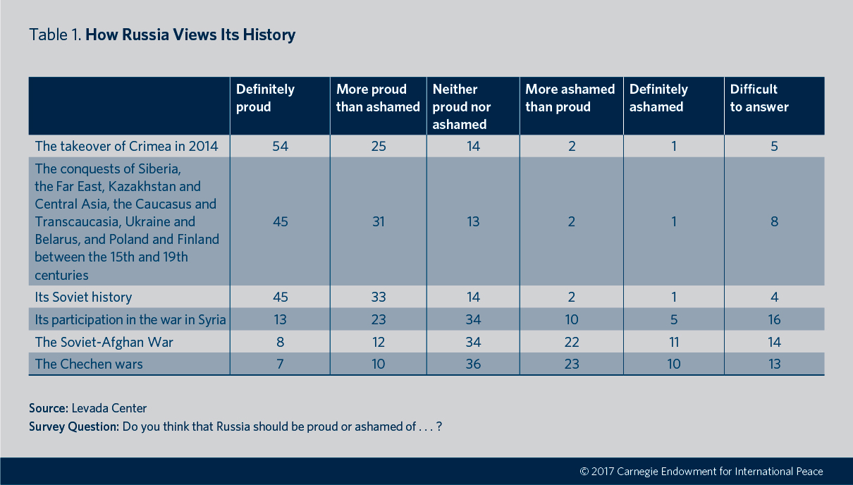 El discurso histórico dominante del liderazgo ruso es imperialista, basado en los conceptos de conquista, militarismo y conservadurismo (después de todo, los territorios conquistados deben mantenerse dentro del imperio). Como la tabla 1 muestra, en marzo de 2016, el 76% de los encuestados dijeron que los rusos deberían estar orgullosos de sus adquisiciones territoriales imperiales que se remontan al siglo XV, incluso de la conquista de Polonia y Finlandia en el XIX. Solo el 3% cree que este pasado imperial es motivo de vergüenza, y el mismo número se siente avergonzado de la historia soviética del país y la anexión de Crimea. Algunos de los pocos aspectos de la historia rusa en los que números sustanciales de encuestados (alrededor de un 33%) se sienten más avergonzados que orgullosos son las guerras de Afganistán y Chechenia. Menos (alrededor de un 15%) muestra signos de vergüenza por la guerra en curso en Siria.