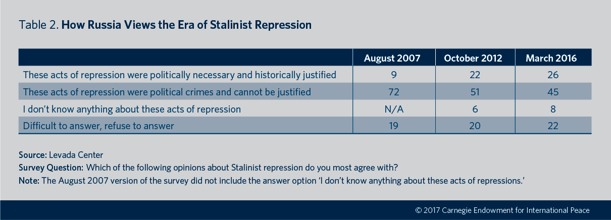 Para muchos ciudadanos rusos, Stalin se convirtió en un héroe ejemplar de la historia rusa, y solo un 38% de los rusos tenía una opinión negativa de su época en 2016. Un mayor número de rusos (54% en marzo de 2016) consideran a Stalin como un personaje que tuvo un papel de alguna manera positivo en la historia del país. Casi un cuarto de los encuestados dicen que la crueldad de Stalin está justificada históricamente y que sus persecuciones eran una necesidad política, una cifra que ha aumentado en un 17% entre 2007 y 2016. Mientras tanto, el número de aquellos que condenan las acciones de Stalin ha decaído del 72 al 45% (ver la tabla 2). El segmento del público ruso que acepta las acciones de Stalin se ha mantenido estable durante una encuesta de seguimiento en abril de 2017.