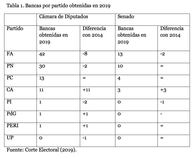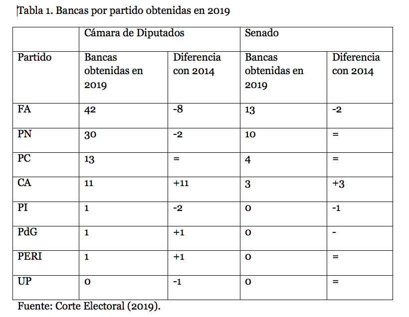 Gane quien gane en el balotaje, no contará con mayoría parlamentaria. La aprobación de la legislación deberá negociarse en las dos Cámaras. El FA pierde la mayoría en ambas, algo que mantenía desde 2005, y acceden al Parlamento dos partidos sin experiencia legislativa: CA y PERI (ver Tabla 1). Resulta llamativo que a pesar de la candidatura y relativo éxito inicial de Talvi, desde el PC los resultados legislativos no hayan variado. No obstante, ahora los 13 diputados y 4 senadores colorados pueden ser clave para la formación de mayorías legislativas.