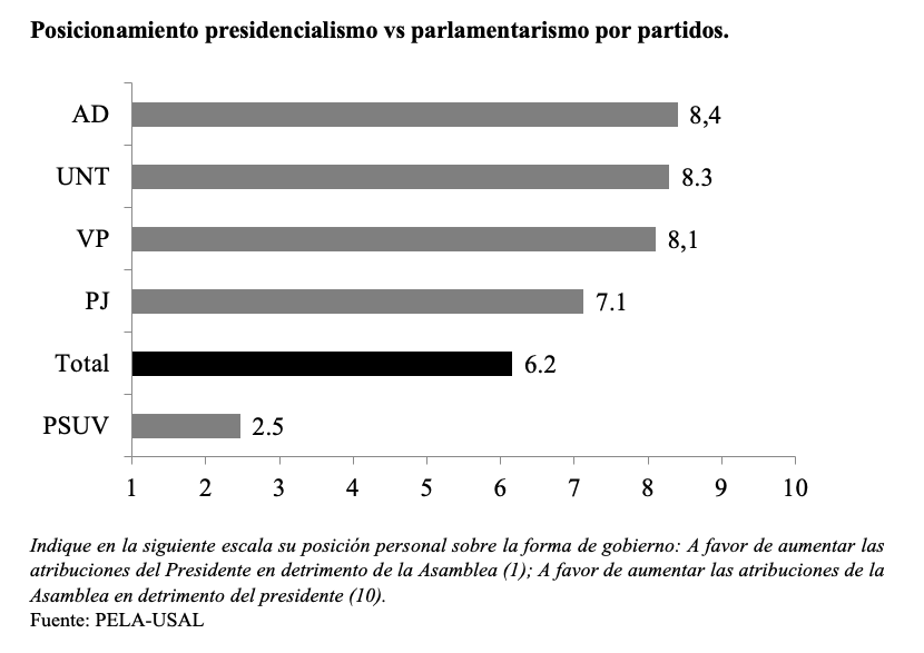 Los datos confirman de manera clara que las diferencias van más allá de la confianza en una institución política o en el proceso electoral. El sistema político se ha ido tensando a lo largo de los últimos años, sin saber convivir en un nuevo escenario donde cada bloque controla un poder. Las actitudes de los diputados hacia el sistema político de Venezuela son muy dispares. Es común en toda América Latina, en base a los datos de PELA-USAL, que los diputados de la oposición apoyen mayores niveles de “parlamentarismo” (cercanos a 10 en la escala), frente a los mayores niveles de “presidencialismo” (cercanos a 1) de los diputados que pertenecen al partido o partidos en el gobierno. Sin embargo, en el caso de Venezuela esta dicotomía es especialmente marcada.