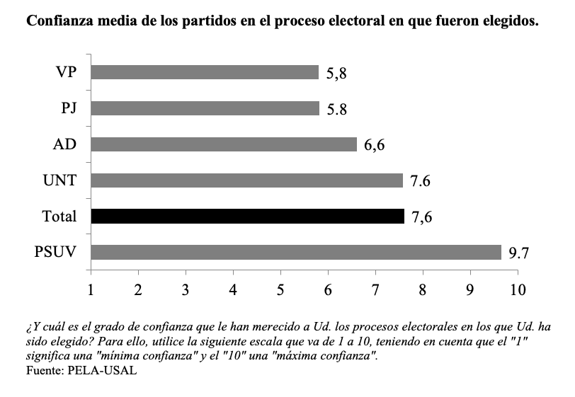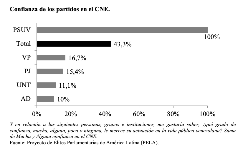 En este punto, resulta conveniente recurrir a evidencia que señale qué piensan los propios partidos de las elecciones y el órgano encargado de organizarlas, el Consejo Nacional Electoral (CNE). En el marco de la base de Datos de Élites Latinoamericanas de la Universidad de Salamanca (PELA-USAL), en abril y mayo de 2016 se entrevistó a los diputados de la Asamblea Nacional electa en las elecciones de diciembre de 2015. En esas elecciones se configuraron dos bloques en el poder legislativo. Por un lado, el oficialismo representado fundamentalmente por el PSUV con 55 escaños (33% de la cámara); por otro, la MUD, cuyos principales partidos son Primero Justicia (PJ), Acción Democrática (AD), Voluntad Popular (VP, al que pertenece Guaidó, y dirigido por Leopoldo López) y Un Nuevo Tiempo (UNT) con 112 escaños (66% de la cámara). Se conformaba así una nueva correlación de fuerzas, un ejemplo más del siempre presente debate sobre equilibrio (inestable) de poderes en sistemas presidenciales. Dos fuerzas opuestas ocupan cada una un poder: PSUV la presidencia, la MUD la Asamblea.