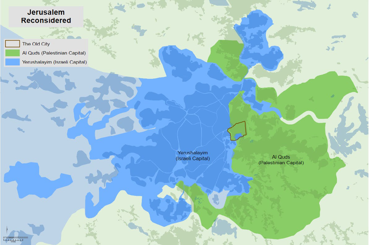 En cuanto a los límites municipales, nuestra propuesta de Jerusalén abierta prevé que el futuro municipio israelí de Yerushalayim incluya los barrios y asentamientos judíos, mientras que el municipio palestino de Al Quds incluiría todos los barrios árabes.